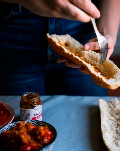 Ce sandwich est encore meilleur avec notre méchouia maison, un incontournable de la cuisine tunisienne préparé à base de poivrons grillés. Associée à la harissa bio Émile Noël, elle apporte une explosion de saveurs relevées mais équilibrées.